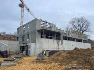 La partie gros œuvre du premier bâtiment et de la maison de quartier touchent bientôt à sa fin, permettant d’aborder dès le début d’année prochaine la phase clos et couvert.